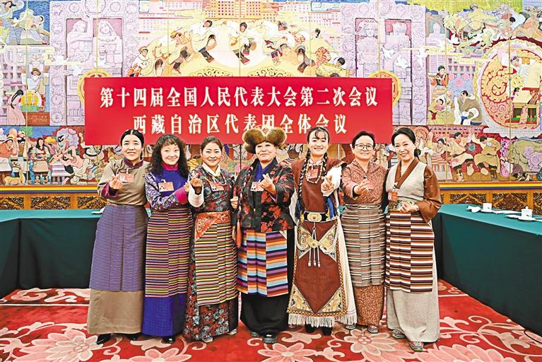 圖為西藏全國人大代表中的“七朵金花”在北京人民大會(huì)堂西藏廳合影留念,并祝福全區(qū)婦女同胞“三八”國際勞動(dòng)?jì)D女節(jié)快樂。