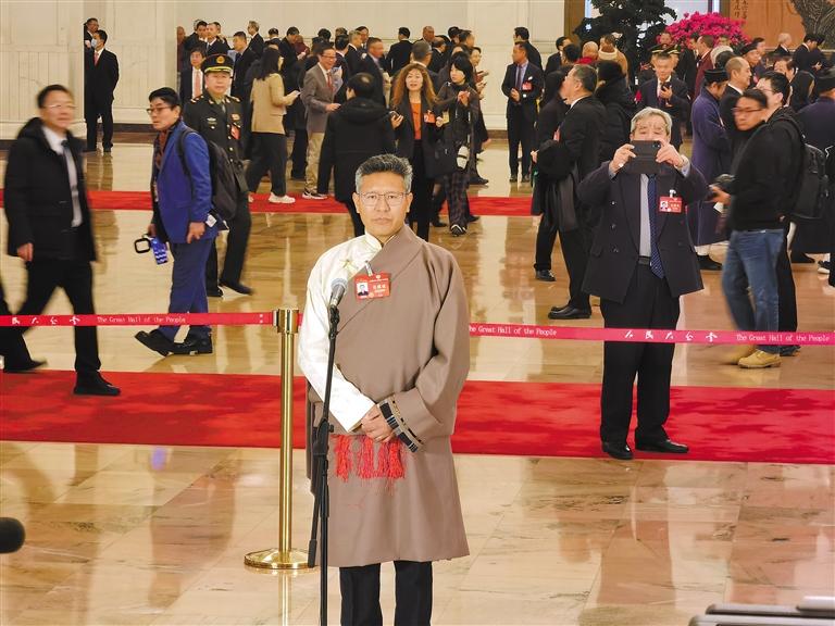 圖為3月7日上午,全國政協(xié)十四屆二次會(huì)議第二場“委員通道”集體采訪活動(dòng)開啟。圖為住藏全國政協(xié)委員達(dá)瓦頓珠亮相“委員通道”并回答記者提問。