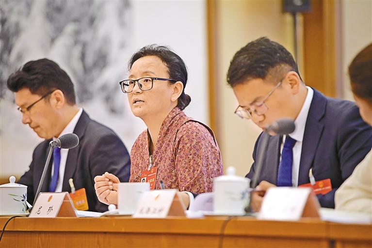 圖為3月7日,西藏代表團(tuán)舉行全體會(huì)議,傳達(dá)學(xué)習(xí)習(xí)近平總書記在看望參加全國政協(xié)十四屆二次會(huì)議的民革、科技界、環(huán)境資源界委員并參加聯(lián)組會(huì)議時(shí)的重要講話,審議國務(wù)院組織法修訂草案,繼續(xù)審查計(jì)劃報(bào)告和草案、預(yù)算報(bào)告和草案。圖為尼珍代表在會(huì)上進(jìn)行討論發(fā)言。記者 旦增西旦 攝