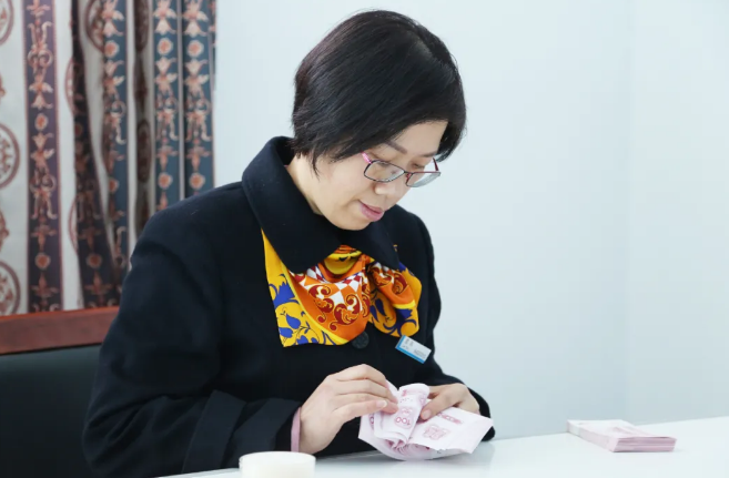 圖為雷燕在展示多指多張手動(dòng)點(diǎn)鈔法。圖片來源于:微山南