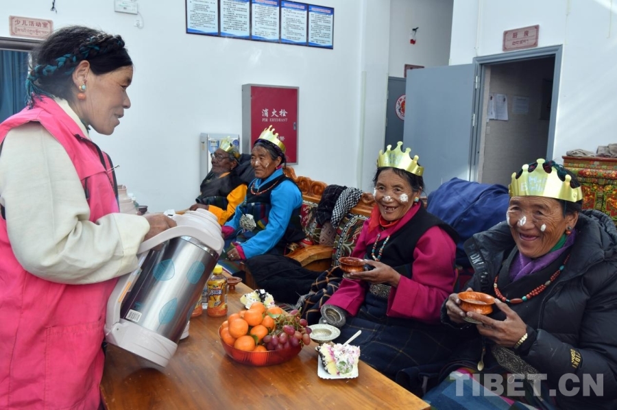冬日的暖陽透過玻璃窗,灑進西藏日喀則定結(jié)縣郭加鄉(xiāng)切村幸福院。老人們圍坐在色彩絢麗的卡墊上,手捧甜茶,一同慶祝集體生日。