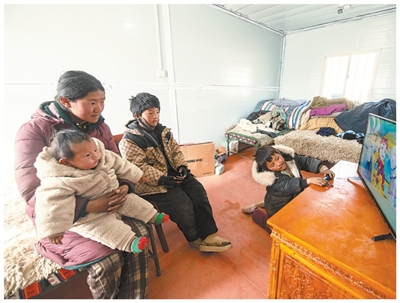 就在前一天,次仁普尺一家已經(jīng)住進(jìn)了溫暖的板房。幾個(gè)弟弟正擠在電視機(jī)前爭(zhēng)搶遙控器,吵著要看各自喜歡的動(dòng)畫(huà)片;媽媽巴桑則在一旁細(xì)心整理著被褥和衣物,將一件件物品歸置妥當(dāng)。