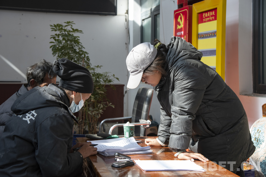 圖為嘎白村村干部塔杰(左)、頓珠巴姆(中)、阿旺德金(右)正在村委會(huì)統(tǒng)計(jì)相關(guān)安置數(shù)據(jù) 攝影:趙振宇